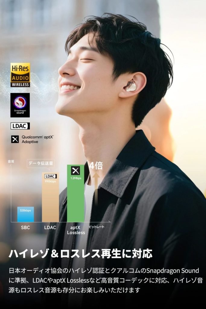 SOUNDPEATS H3の最大の魅力は、ハイレゾ&Snapdragon Soundに準拠した性能。従来のイヤホンと比べて解像度が高く、細かい音までクリアに再生可能です。音場の広がりも感じられ、ライブ音源やクラシックなども臨場感豊かに楽しめます。特に、楽器の分離感が際立っており、ボーカルと伴奏のバランスが心地よく再現される点は評価に値します。すごい。