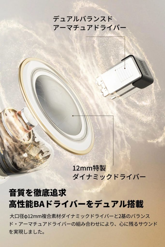 SOUNDPEATS H3には大口径の12mmダイナミックドライバーが搭載されています。これにより、低音から高音までバランスの取れたサウンドを実現。低音は厚みがありながらも過度に主張せず、中高音域はクリアで伸びやかです。ポップスやロック、ジャズなど幅広いジャンルに対応できる点もポイントですね!
